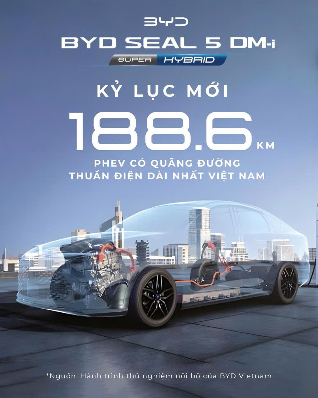 Không chỉ gây chú ý với hành trình tổng thể, BYD Seal 5 DM-i Super Hybrid còn lập thêm một kỷ lục khác: PHEV có quãng đường di chuyển thuần điện dài nhất Việt Nam – 188,6 km.