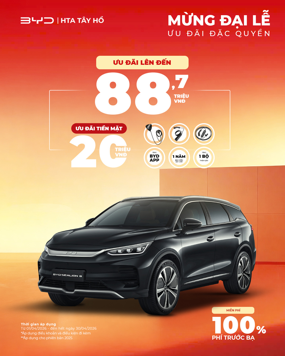 BYD Sealion 8 là mẫu SUV hướng đến khách hàng yêu cầu cao về không gian, công nghệ và trải nghiệm vận hành. Trong tháng 04, khách hàng khi mua xe sẽ được miễn phí 100% lệ phí trước bạ, nhận thêm 20 triệu đồng tiền mặt cùng bộ quà tặng chính hãng.